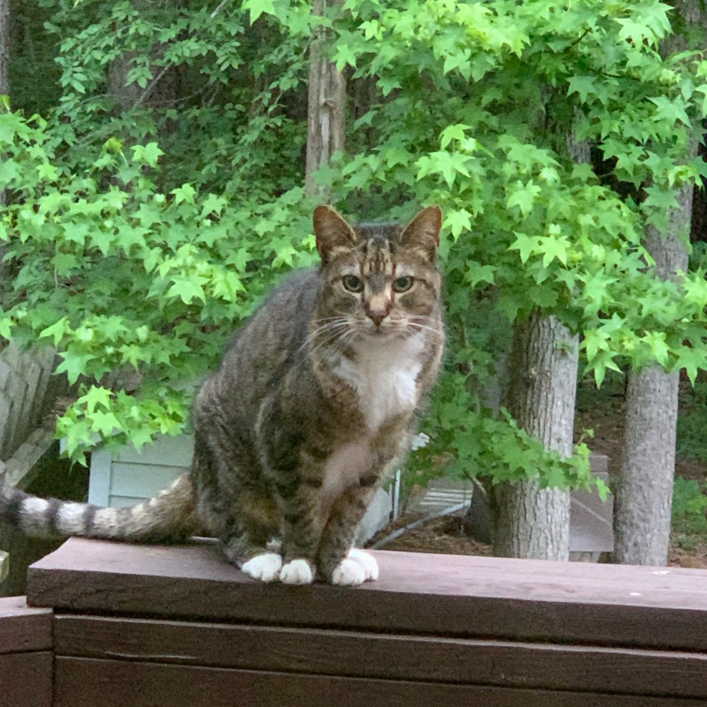 After Kody died Tinky was left alone. It took a little while but he soon realized that he had the run of the deck, the yard, and all areas within the fence and beyond. His realm at last. The closest he would come to the inside was the sun room equipped with a pet door, and only then because food and water were regularly provided by his large, but slow moving, servants. Over the last few years a family of raccoons also discovered the pet door and the food within, leading to some amusing confrontations between wild animals and a wild animal wannabee. Tinky almost never attacked them as they came for his food, nor did he run away, perhaps accepting a strange hierarchy of domestication.